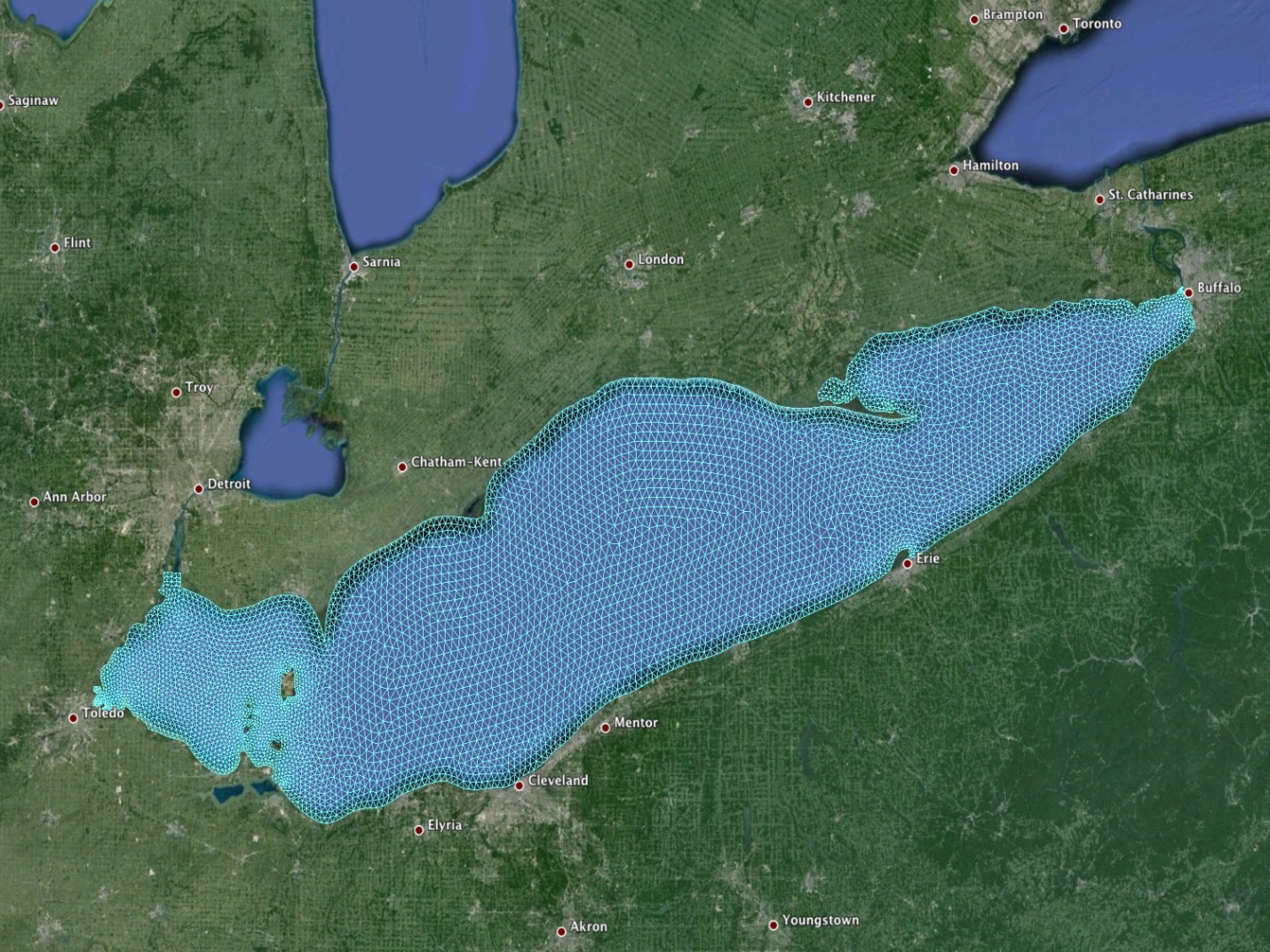 https://tidesandcurrents.noaa.gov/images/leofs_model_grids.pngThe Lake Erie OFS model is calculated using a bathymetry following irregular grid with over 6,100 nodes. The results of this computation are then sampled, by OFS, into a regular latitude / longitude aligned grid. The data on this regular grid are then converted to GRIB format by LuckGrib.